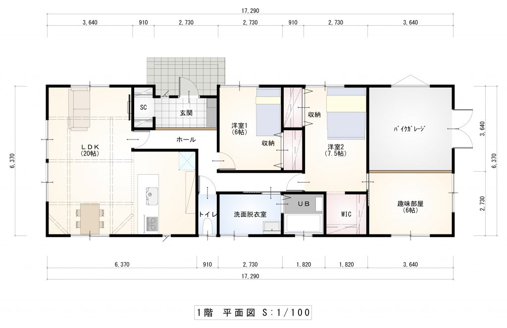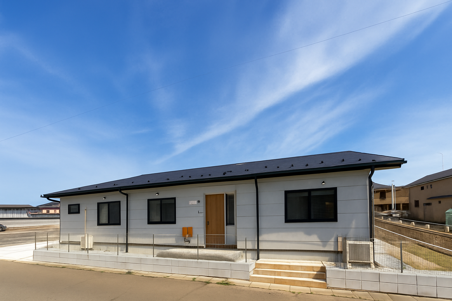 落着いた外観、木目調の玄関ドアが調和したナチュラルかつモダンな雰囲気な平屋