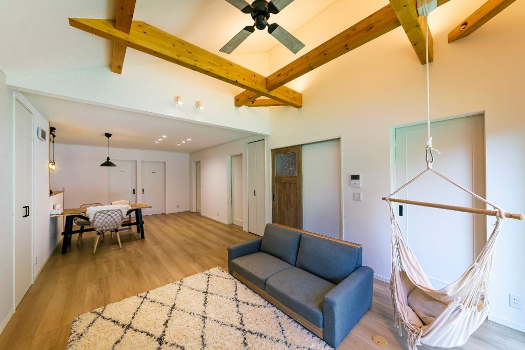 ✅26畳を超える広さの明るく開放的なLDK。表し梁も良いアクセントに。廊下をなくし、リビングから各部屋との行き来をショートカットした間取りも👍