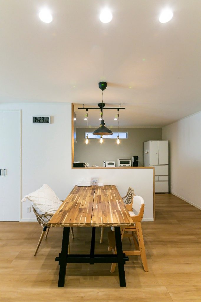 ✅アイアンの照明と温かみのある無垢調のテーブル。ヴィンテージ感あふれるインテリアが魅力のダイニングです✨